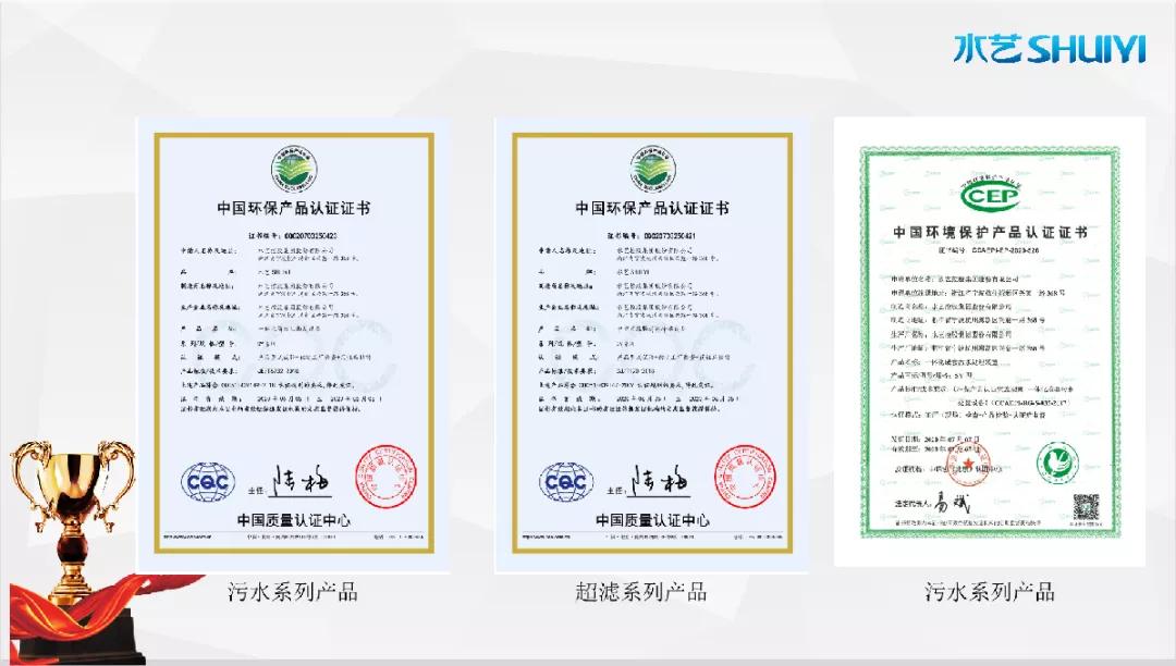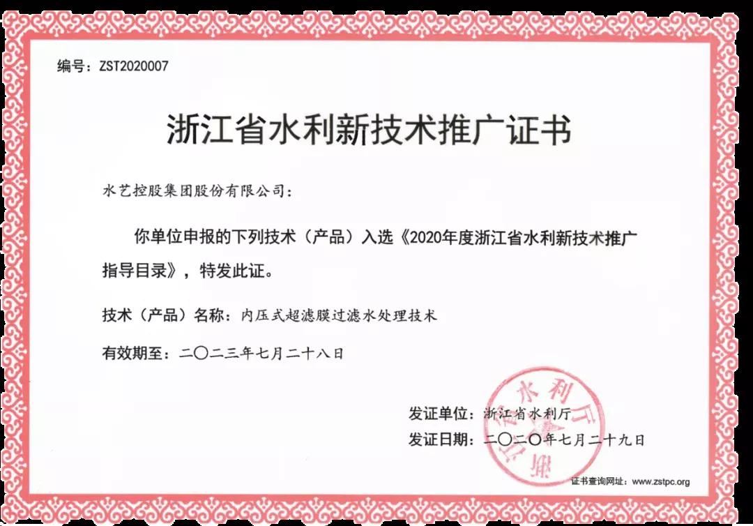 2020年,“Slufri-MBR一體化高效生物反應(yīng)器”與“中空纖維膜超濾凈水設(shè)備”系列產(chǎn)品通過中國質(zhì)量認(rèn)證中心(CQC)“中國環(huán)保產(chǎn)品認(rèn)證”。與此同時,“Slufri-MBR一體化高效生物反應(yīng)器”通過了中國環(huán)境保護(hù)產(chǎn)業(yè)協(xié)會(CCAEPI)"中國環(huán)境保護(hù)產(chǎn)品認(rèn)證”。七月,水藝內(nèi)壓式超濾膜過濾水處理技術(shù)入選《2020年度浙江省水利新技術(shù)推廣指導(dǎo)目錄》。